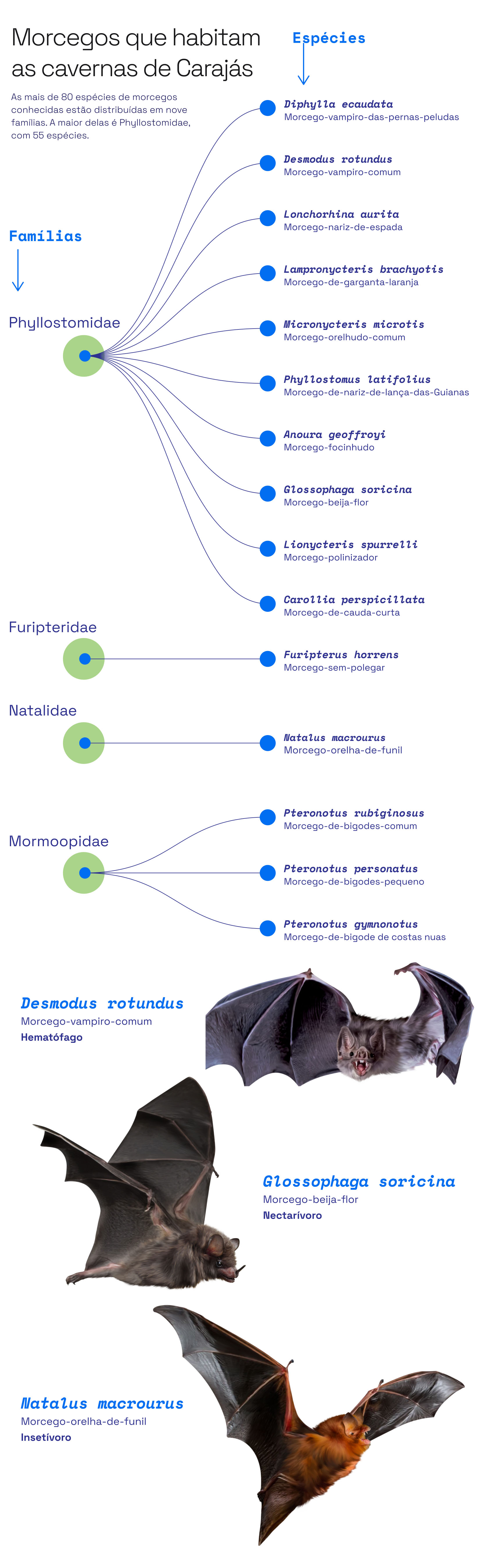 Apesar de, no senso-comum, os morcegos serem conhecidos por se alimentarem de sangue, apenas três espécies são hematófagas no mundo. Duas delas estão presentes em Carajás: o morcego-vampiro-comum (Desmodus rotundus) e o morcego-vampiro-das-pernas-peludas (Diphylla ecaudata). Com incisivos cortantes, eles dobram a língua e fazem uma espécie de canudo para sugar o sangue. Para garantir o fluxo do alimento, a saliva possui uma substância anticoagulante.
