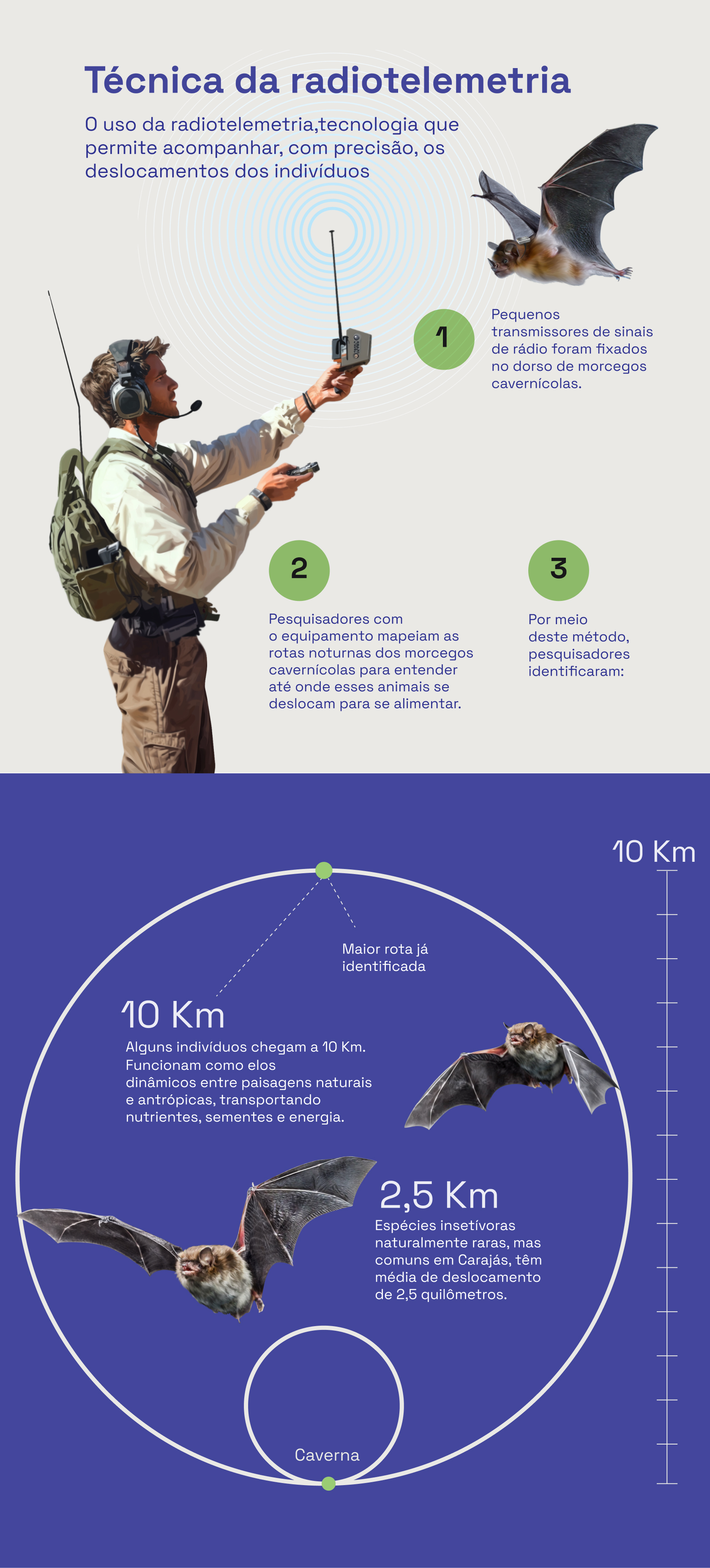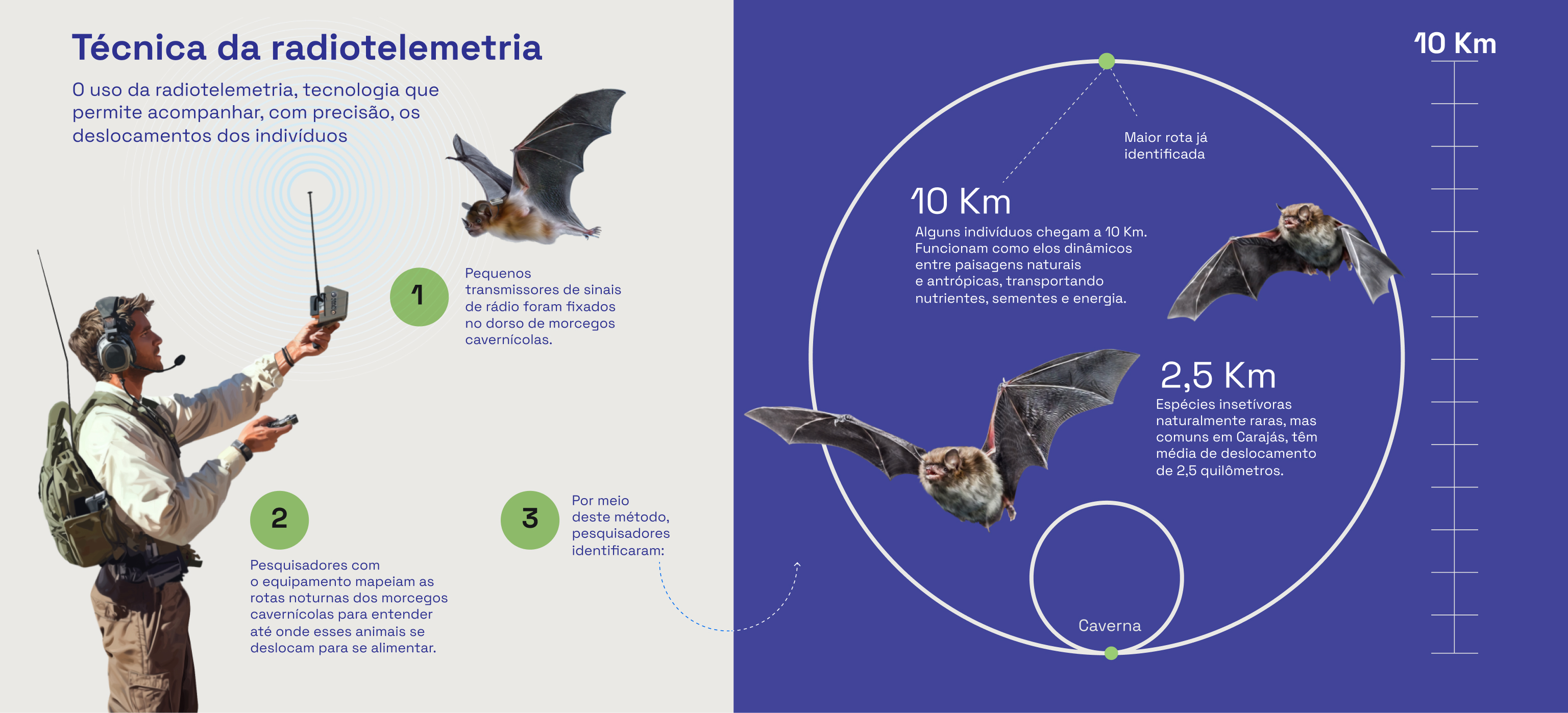 Um dos avanços mais interessantes na pesquisa se deu pelo uso da radiotelemetria, tecnologia que permite acompanhar, com precisão, os deslocamentos dos indivíduos. Em um estudo conduzido pelo ITV e pela Vale, pequenos transmissores de sinais de rádio foram fixados no dorso de morcegos cavernícolas. O objetivo era mapear suas rotas noturnas e entender até onde esses animais se deslocam para se alimentar. “Achávamos, por exemplo, que o F. horrens voava apenas no entorno da caverna, mas na verdade a espécie circula por grandes distâncias. Isso indica que ele pode estar forrageando em áreas abertas, o que muda nossa compreensão sobre o uso do habitat”, diz Valéria Tavares.