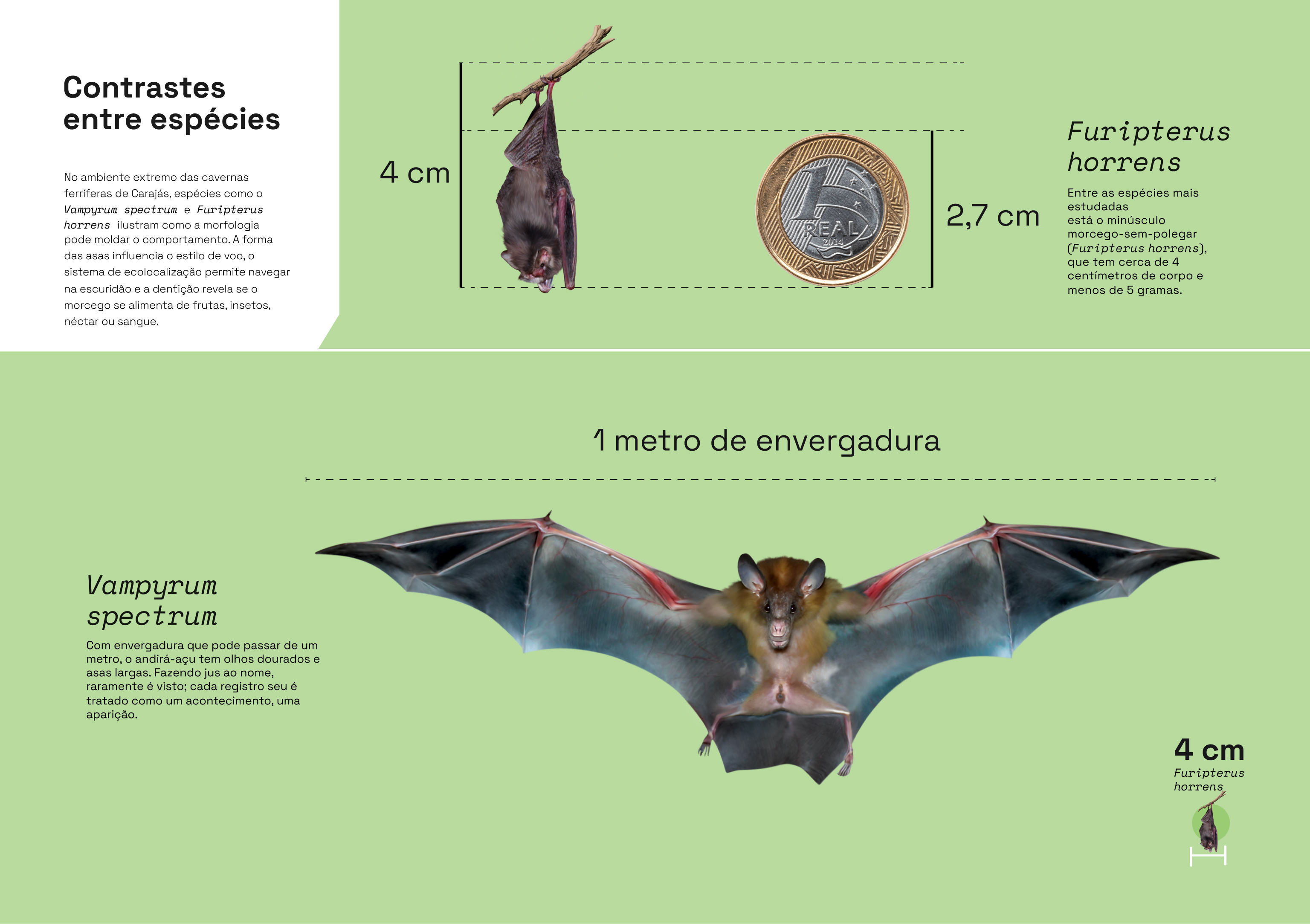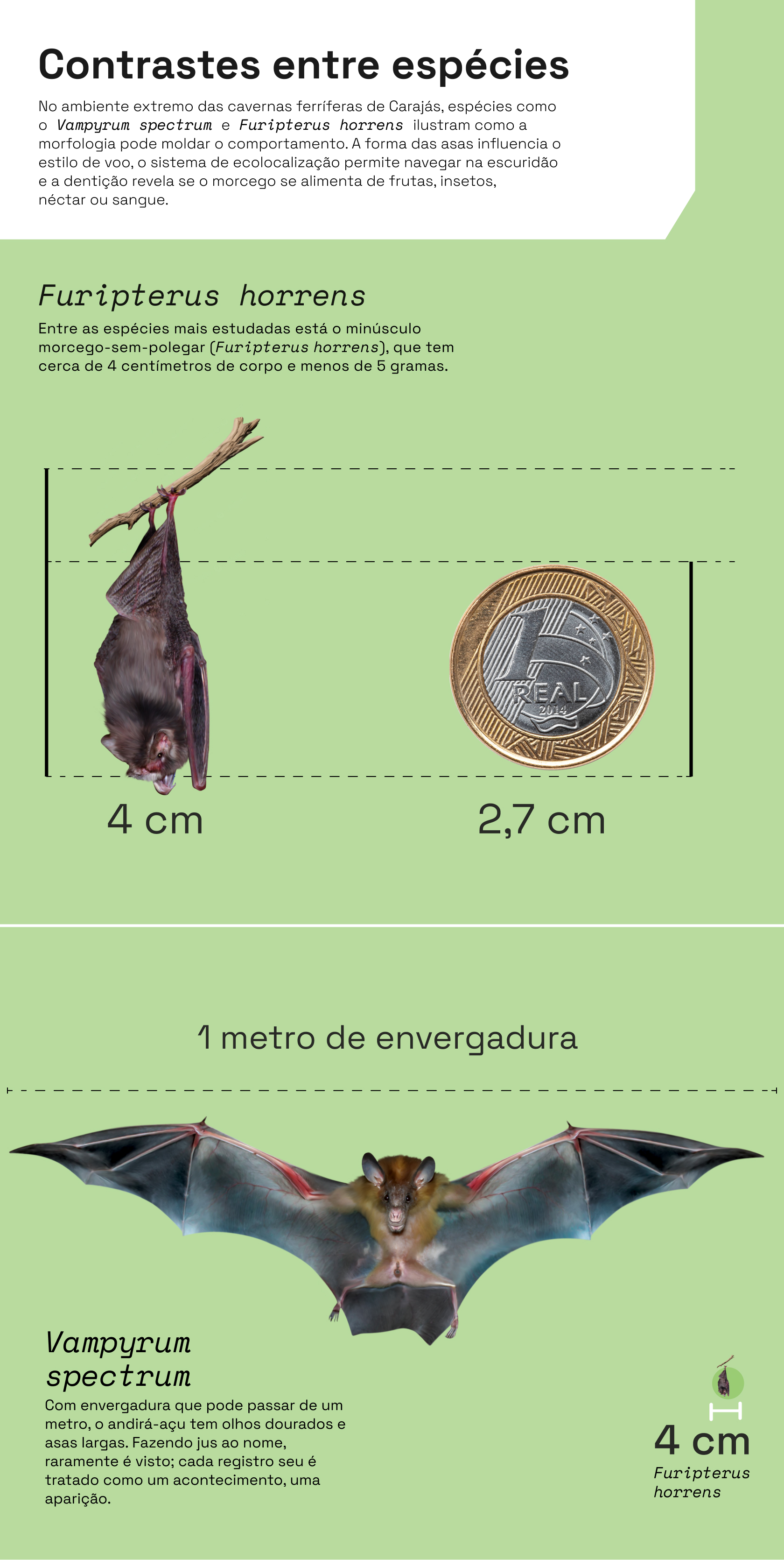 Mais de 80 espécies de morcegos habitam a Floresta Nacional de Carajás, no sudeste do Pará. Algumas se alimentam de néctar e polinizam uma vasta variedade de plantas. Outras, ao se alimentarem de insetos, regulam as populações e evitam desequilíbrios, como as pragas para a agricultura.