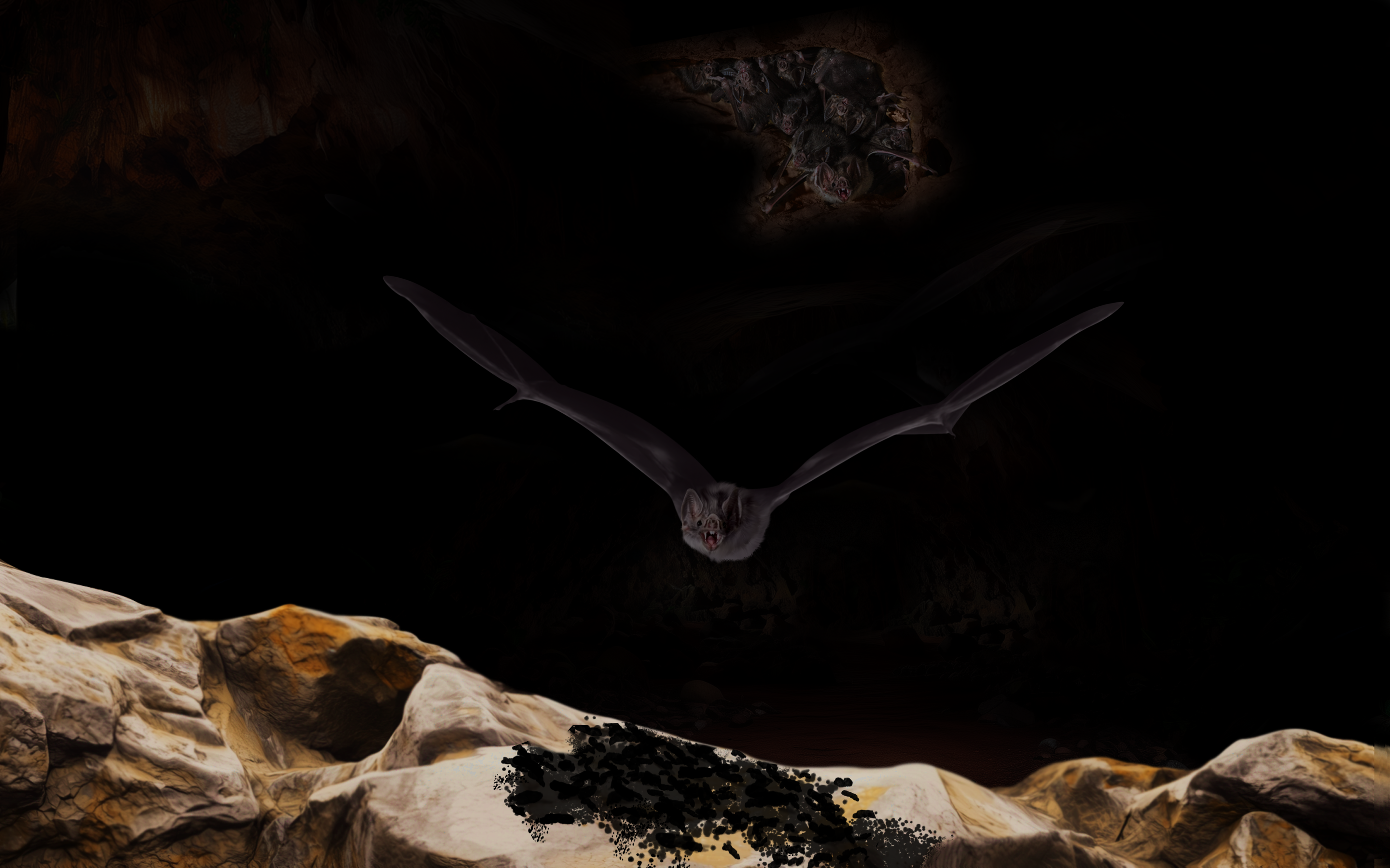Na escuridão de uma das mais de 2 mil cavernas ferríferas cavernas que se formam em rochas de minério de ferro também conhecido como ecolocalização, o sistema sonar dos morcegos emite ondas sonoras que rebatem nos objetos e retornam aos morcegos, produzindo eco. Assim, esses mamíferos conseguem 'ver' por meio do som e se locomovem ou caçam em ambientes escuros.Cavernas ferríferas