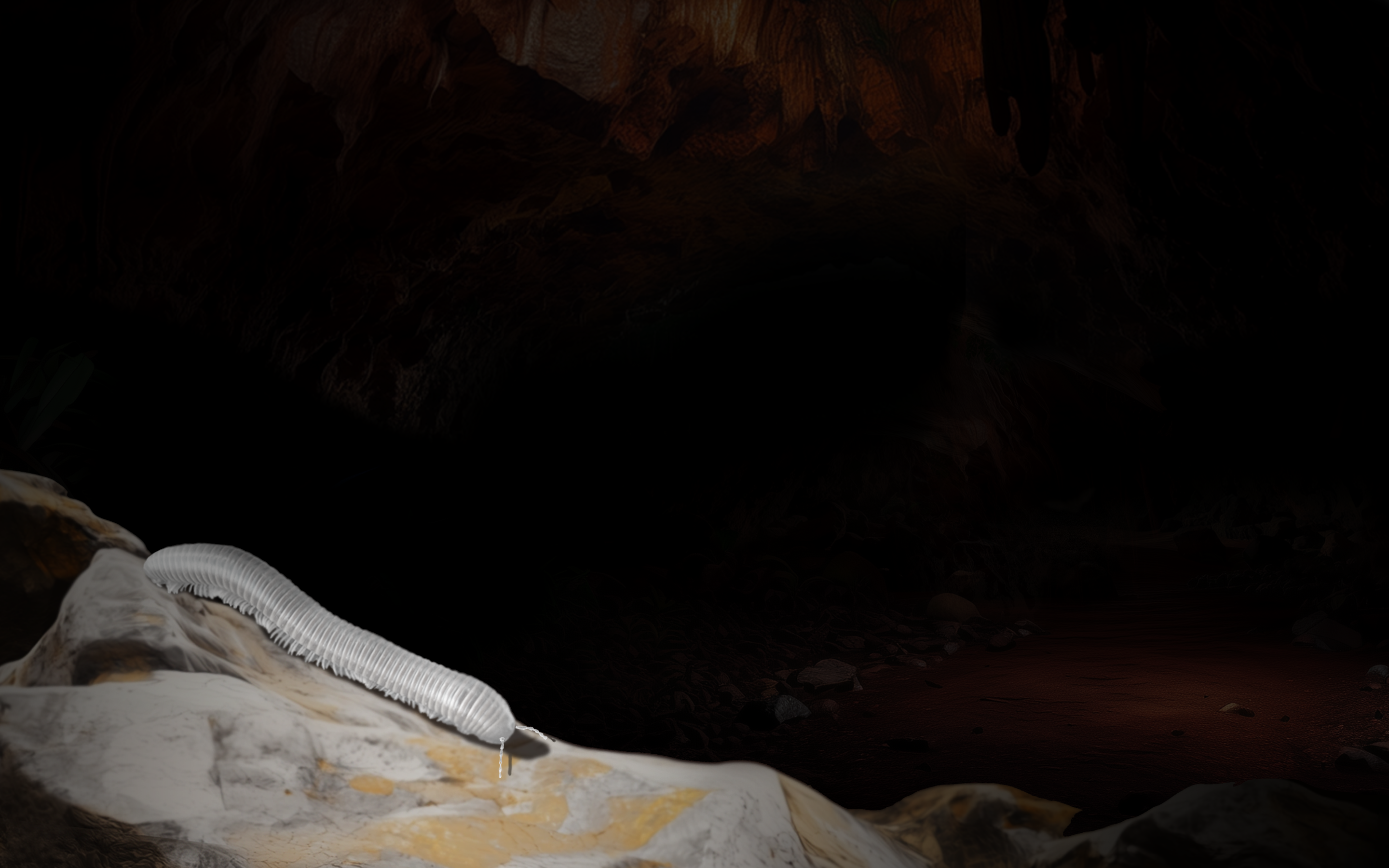 São bichos que desenvolveram adaptações extremas, como perda total ou parcial dos olhos e pigmentação reduzida. São, portanto, totalmente dependentes das cavernas. Aqui, um diplópode.