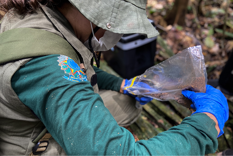 Vestindo luvas, camisa de mangas longas, botas, com cabelos presos e máscara cirúrgica, a bióloga Luanne Lima segura um borrifador com um líquido descontaminante e uma espátula. A pesquisadora se coloca em pé em meio às árvores e se prepara para fazer uma coleta de amostras de solo. O material reunido será embalado em pequenos sacos plásticos fechados hermeticamente e guardado no gelo até ser encaminhado para um laboratório. Cientistas buscam, nas amostras, moléculas de DNA molécula fundamental para a hereditariedade e o funcionamento celular; o DNA (ácido desoxirribonucleico) contém as instruções genéticas necessárias para o desenvolvimento, crescimento, reprodução e manutenção dos organismos vivos, desde bactérias até seres humanosDNA