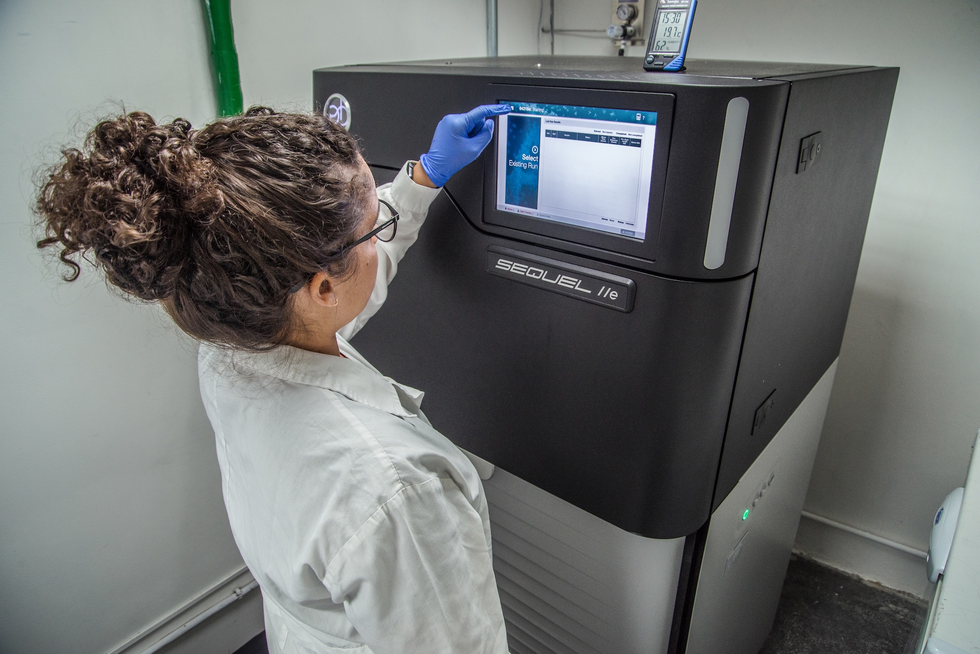 Pesquisadora Amanda Vidal opera o PacBio, equipamento destinado ao sequenciamento de genomas de referência, no laboratório do ITV em Belém. Os custos de importação de máquinas como esta são um dos fatores que encarecem o trabalho de sequeciamento genômico no Brasil. FOTO: Miguel Aun / Acervo do Instituto Tecnológico Vale